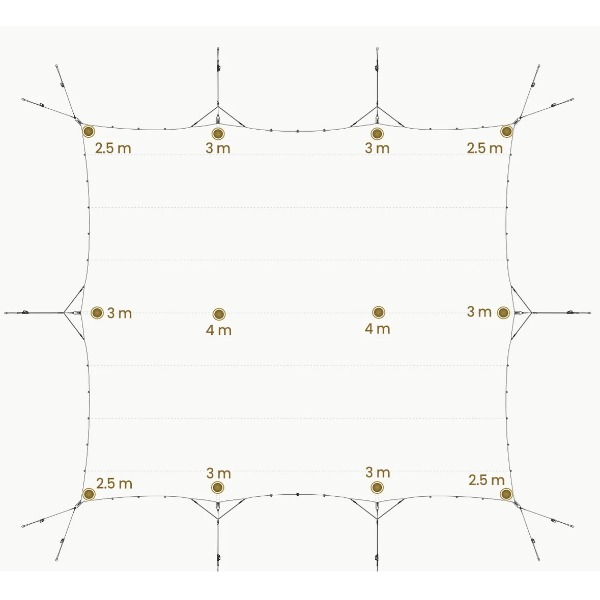 De set bevat Douglas houten palen (Ø 75 mm) voorzien van gegalvaniseerde stalen ogen, zwarte spanbanden met ratels, touwsets, haringen, en karabijnhaken. De middenpalen (Ø 95 mm) zijn voorzien van een paaldop aan het uiteinde.