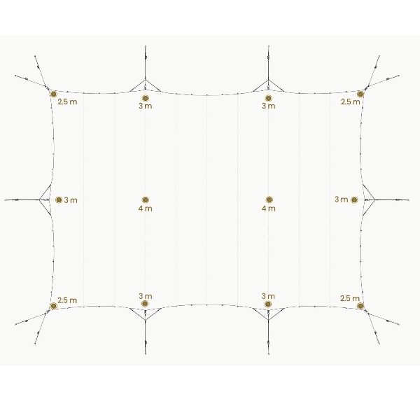 De set bevat Douglas houten palen (Ø 75 mm) voorzien van gegalvaniseerde stalen ogen, zwarte spanbanden met ratels, touwsets, haringen, en karabijnhaken. De middenpalen (Ø 95 mm) zijn voorzien van een paaldop aan het uiteinde.